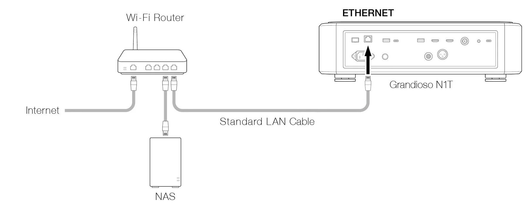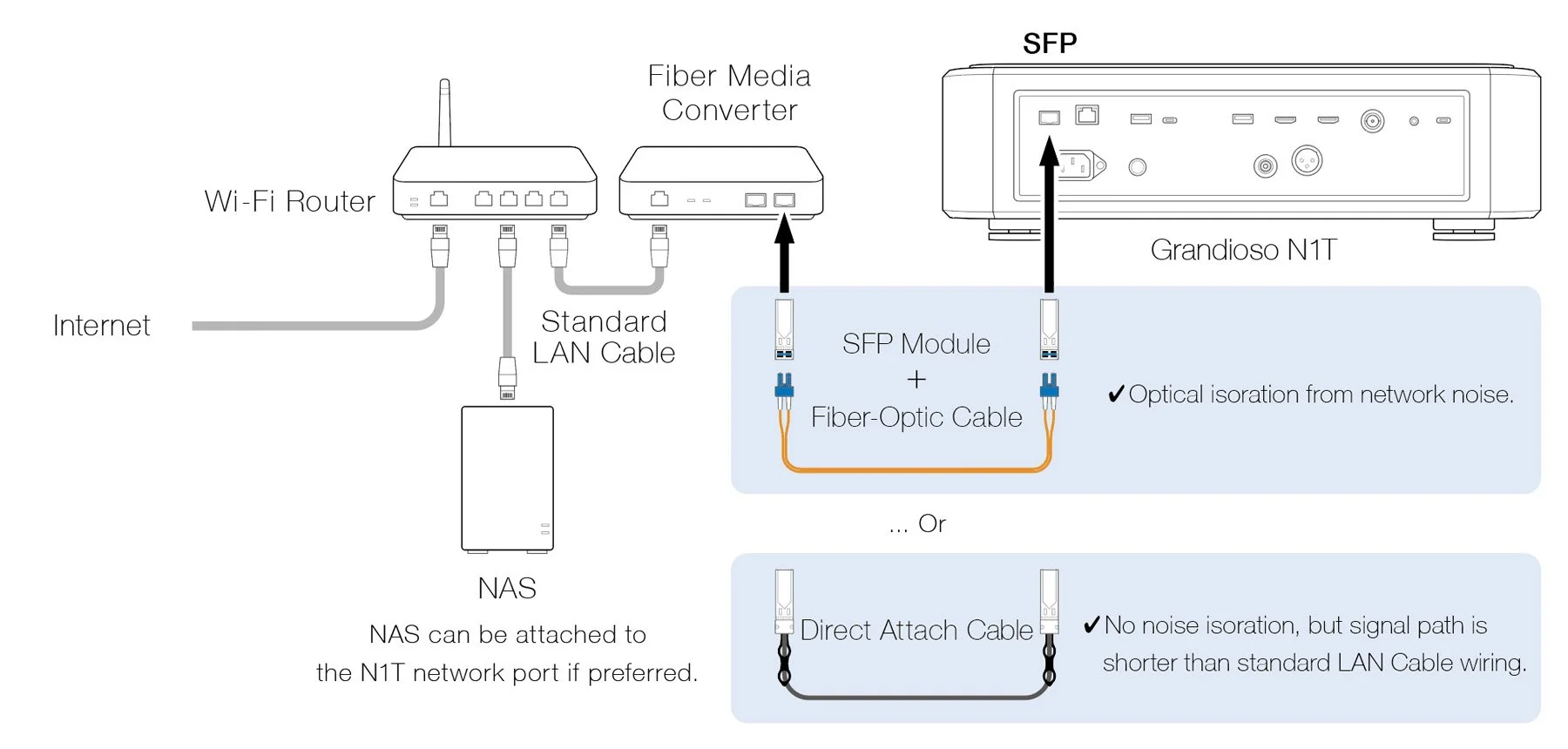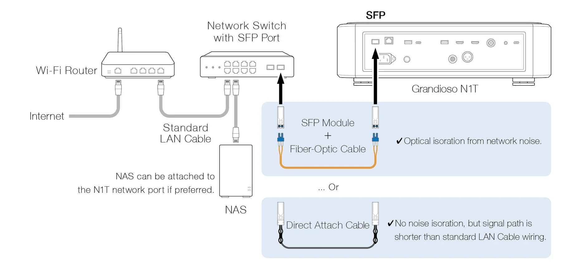 By connecting the N1T to an external network device (such as a switch) using an SFP module and fiber optic cable, you can isolate the signal from network noise, achieving unparalleled purity in playback. Alternatively, a metal cable connection using a Direct Attach Cable (DAC) can simplify the network signal path by reducing the number of circuits involved. For maximum flexibility, both the RJ45 and SFP ports can be used simultaneously. For example, you can connect a NAS to the RJ45 port while using the SFP port for an external network connection (or vice versa), tailoring the setup to your preferences and requirements.