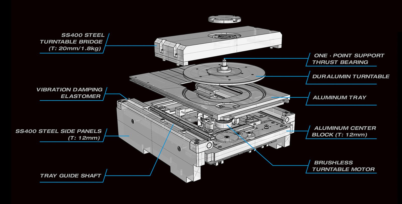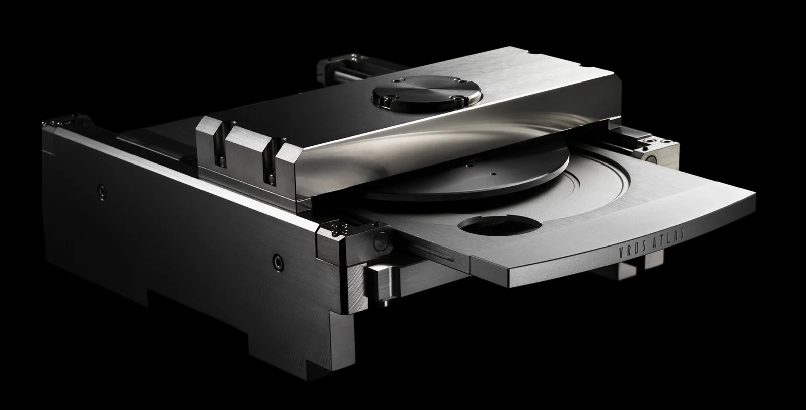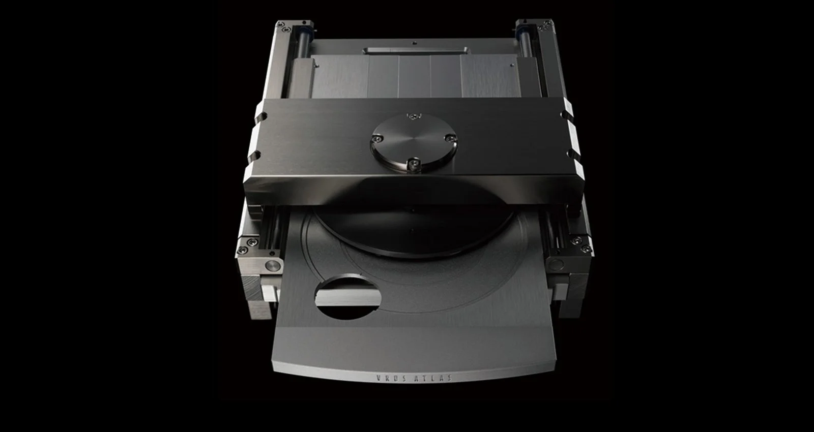 ATLAS boasts the highest rigidity and weight in the history of VRDS mechanisms. With its larger new SS400 steel side panels and bridge, the ATLAS is 27% heavier (6.6kg mechanism unit, 13.5kg including base) than the NEO, achieving both exceptional rigidity and impressive tone. It also dampens any and all vibration that might adversely affect audio quality. The turntable is machined from solid duralumin for excellent audio quality, and its spindle features a newly designed thrust bearing system. This friction-free one-point spindle support system ensures smooth, noiseless turntable rotation.